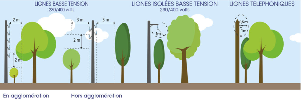 Si les plantations sont implantées sur une propriété privée et que les distances entre les branches et les lignes ne respectent pas la réglementation (voir illustrations), alors conformément à l’article 85 de la Loi du 7 octobre 2016 pour une République numérique, il est de la responsabilité du propriétaire du terrain, du fermier ou leurs représentants, de prendre en charge les opérations d’entretien des abords d’un réseau ouvert au public telles que le débroussaillage, la coupe d’herbe et l’élagage. L’élagage peut être réalisé par le propriétaire lui-même ou par une entreprise agréée de son choix.