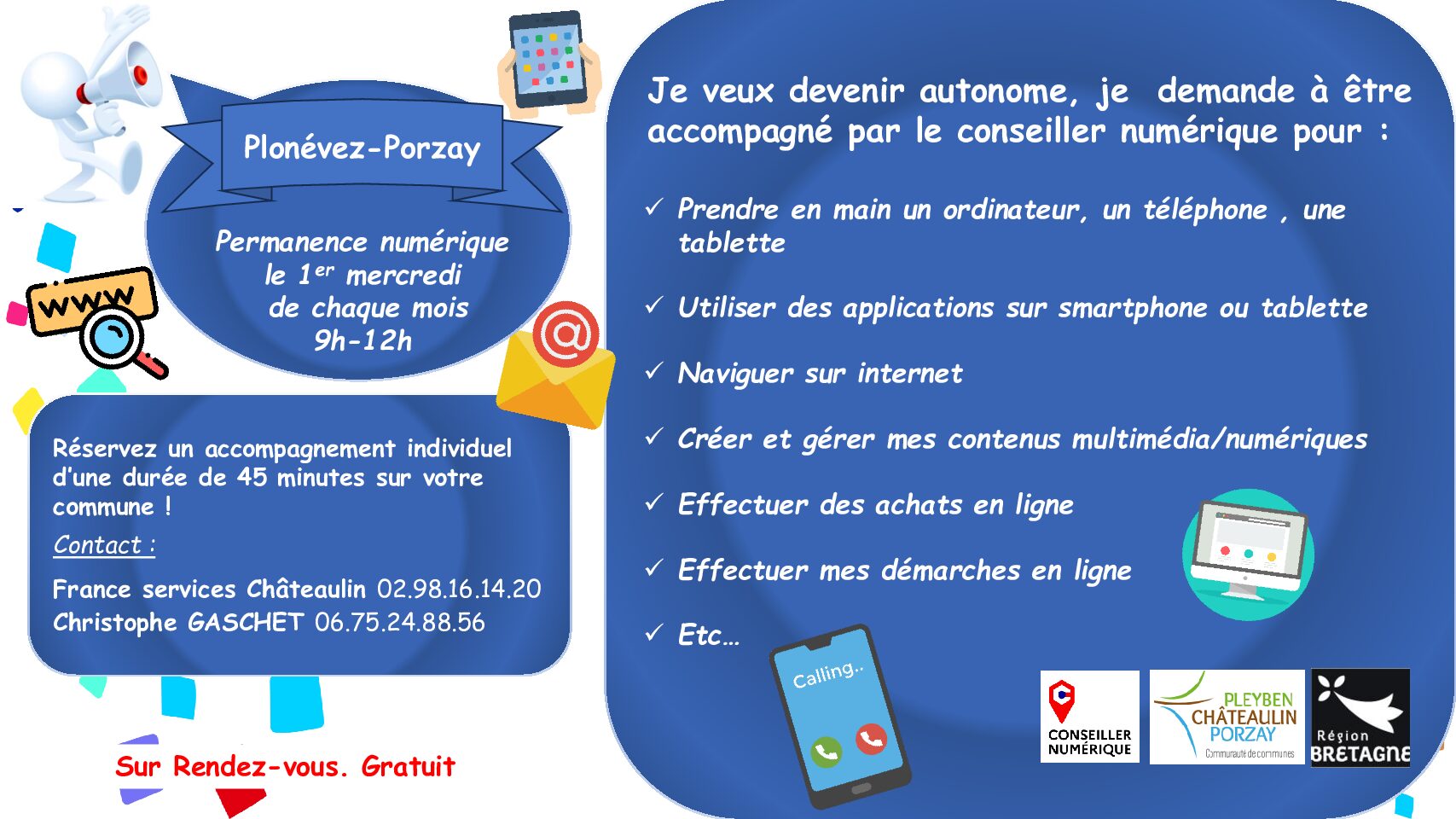 PERMANENCE NUMÉRIQUE Réservez un accompagnement individuel d’une durée de 45 minutes sur votre commune ! Contact : France services Châteaulin : 02.98.16.14.20 ou Christophe Gaschet : 06.75.24.88.56 – Prendre en main un ordinateur, un téléphone, une tablette ; utiliser des applications sur smartphone ou tablette ; naviguer sur internet ; créer et gérer mes contenus...