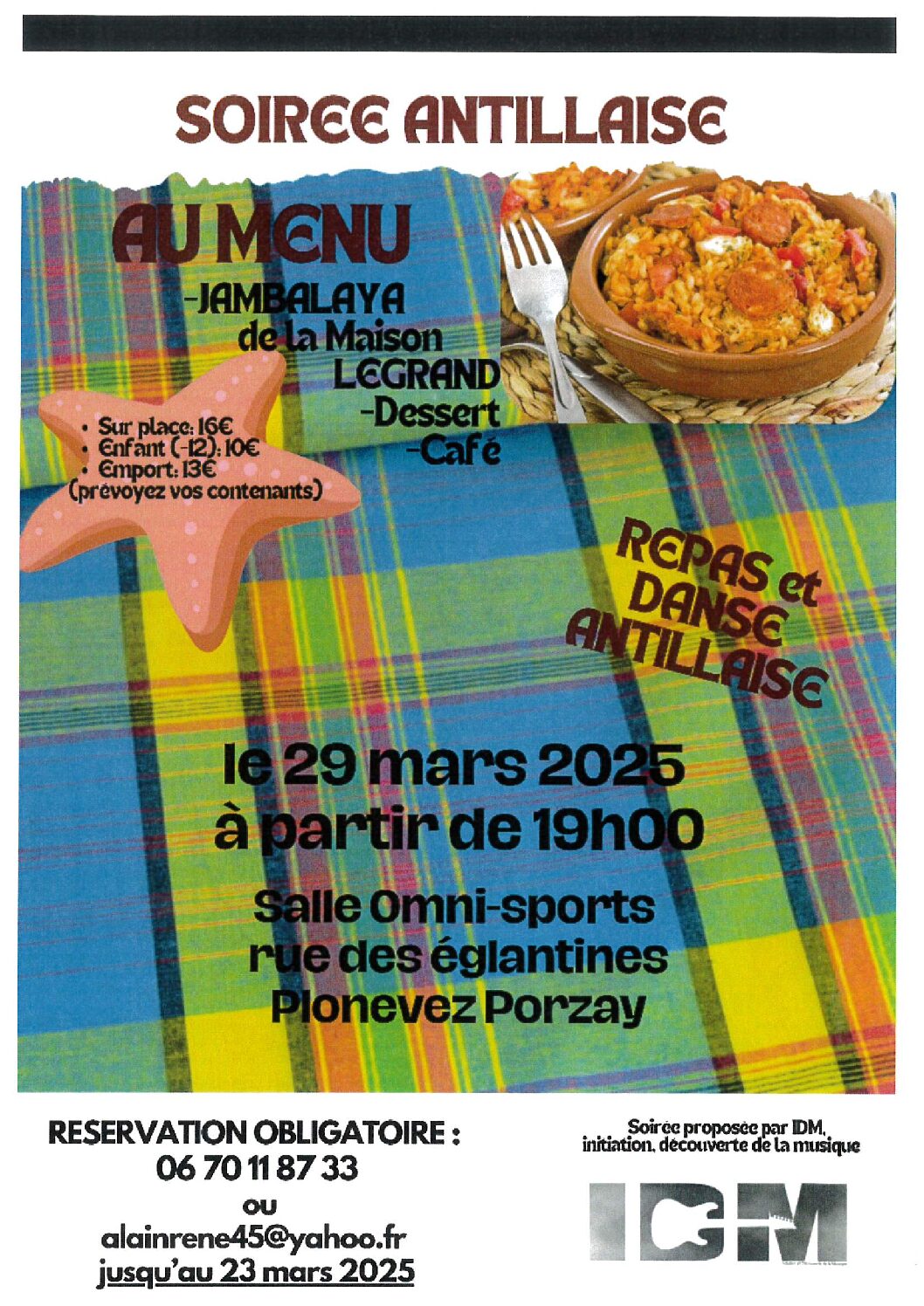 IDM – INITIATION ET DÉCOUVERTE DE LA MUSIQUE L’association IDM vous propose le samedi 29 mars à partir de 19h, salle polyvalente, « une Soirée Antillaise » : repas et animation musicale. Au menu « Jambala » de la maison Le Grand, dessert & café. Sur place : 16€, enfant – 12 ans : 10€, à emporter...