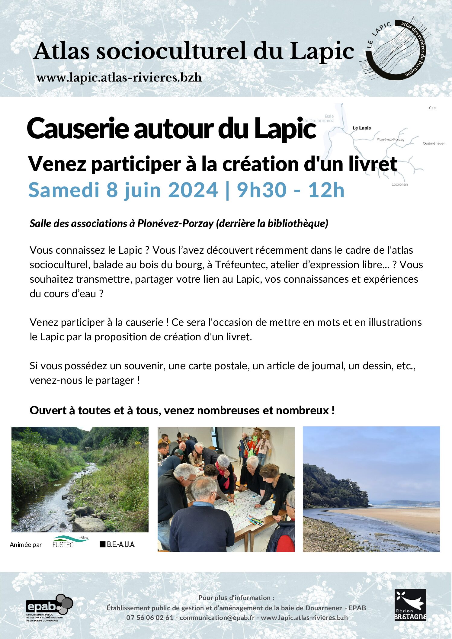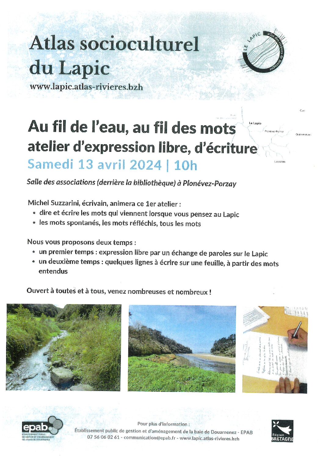 Dans le cadre du projet d’atlas socioculturel du Lapic, nous vous proposons une rencontre : le samedi 13 avril 2024, à 10h, à la salle des associations à Plonévez-Porzay (derrière la bibliothèque) Au fil de l’eau, au fil des mots – atelier d’expression libre, d’écriture Michel Suzzarini, écrivain,...