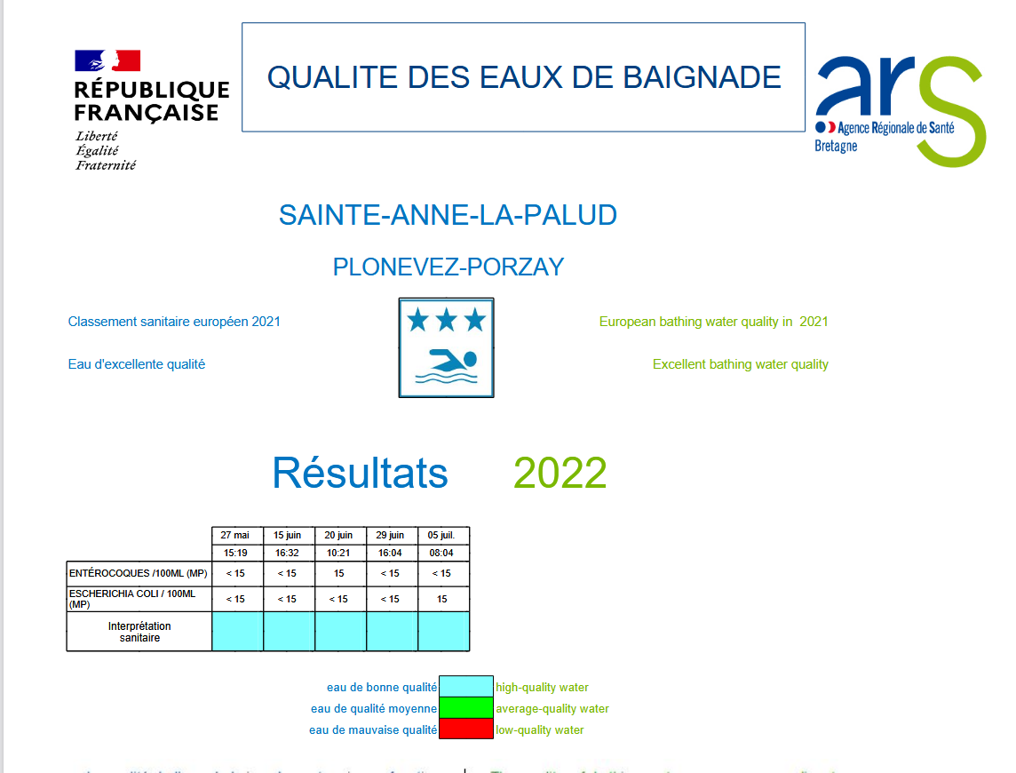 Qualité des eaux de baignade – plages de Kervel et de Sainte Anne la Palud. 5 juillet 2022 : cliquer ici